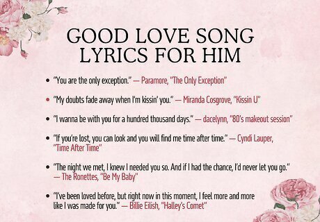 Throw out a love song lyric to make him feel valued and cherished. According to licensed psychologist Sarah Schewitz, PsyD, “men, more than anything, want to be appreciated for what they do.” Sharing a romantic lyric is a simple way to express your affection and admiration, strengthening your connection. Here are the best lyrics for him: “You are the only exception.” — Paramore, “The Only Exception” “Baby, I’m yours, if you’re crazy for me.” — Soccer Mommy, “rom com 2004” “My doubts fade away when I’m kissin’ you.” — Miranda Cosgrove, “Kissin U” “Why can’t I breathe whenever I think about you?” — Liz Phair, “Why Can’t I?” “I wanna be with you for a hundred thousand days.” — dacelynn, “80’s makeout session” “I feel soft around you. Comfortable and warm, and far from any harm.” — Babygirl, “Soft” “If you’re lost, you can look and you will find me time after time.” — Cyndi Lauper, “Time After Time” “I fall in love with the little things, counting the tattoos on your skin.” — Troye Sivan, “Angel Baby” “The night we met, I knew I needed you so. And if I had the chance, I’d never let you go.” — The Ronettes, “Be My Baby” “I’m a lover, not a fighter. But if anyone tried to hurt you, I would be ruthless for you.” — Kacey Musgraves, “Ruthless” “I’ve been loved before, but right now in this moment, I feel more and more like I was made for you.” — Billie Eilish, “Halley’s Comet” “Hit me like a ray of sun burning through my darkest night. You’re the only one I want. Think I’m addicted to your light.” — Beyoncé, “Halo” “It’s the way that you know what I thought I knew. It’s the beat that my heart skips when I'm with you.” — Beyoncé (feat. Jay-Z), “Crazy in Love” “If tomorrow never comes, I would want just one wish, to kiss your quiet mouth and trace the steps with my fingertips.” — Michelle Branch, “It’s You (+ “Outro”) “You need a place to land, I’ll be the floor. If you need an easy out, I’ll be the door. If you need a song to sing, I’ll be the chords. The wind beneath your wings, I’ll be the source.” — Maren Morris, “because, of course”
