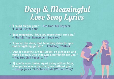 Share a meaningful song lyric that’s extra passionate and romantic. When it comes to showing love, don’t be afraid to be vulnerable (or even a little sappy). That way, the other person knows how much you mean to them! Here are some deep and meaningful song lyrics to let someone know they’re the love of your life: “I could die for you.” — Red Hot Chili Peppers, “I Could Die for You” “For what it’s worth, I love you.” — The Cardigans, “For What It’s Worth” “Just remember, I love you more than I can say.” — Firefall, “Just Remember I Love You” “I keep dreaming there’s a somewhere that we grow old together.” — MAX & keshi, “IT’S YOU” “Look at the stars, look how they shine for you and everything you do.” — Coldplay, “Yellow” “You get me when nobody understands. You come and take the chance, baby.” — Michelle Branch, “You Get Me” “And if I saw the sun fall down, I’d pick it up and make a crown. One that was a perfect fit for you.” — Red Hot Chili Peppers, “If” “You’re my North Star when I’m feeling lost and blue.” — Tom Waits, “Little Trip to Heaven (On The Wings Of Your Love)” “If you’ve ever looked up at a sky with no blue, then you’ve seen a picture of me without you.” — George Jones, “A Picture of Me (Without You)” “There’s no feeling better, the stare in your iris. To know that I fully am seen ‘cause, oh, it’s you. All I want, all I see.” — HOAX, “into the blackhole” “And if you have to walk a million miles, I’ll wait a million days to see you smile. Distance and time, I’ll be waiting.” — Alicia Keys, “Distance and Time” “You’re the one that I belong to. I’ll be the embrace that keeps you warm, for you’re the sun that breaks the storm.” — Vanessa Carlton, “Pretty Baby” “Now and then, it seems that life is just too much. But you've got the love I need to see me through.” — Florence + The Machine, “You’ve Got the Love” “If the sun refused to shine, I would still be loving you. When mountains crumble to the sea, there will still be you and me.” — Led Zeppelin, “Thank You” “I have died everyday, waiting for you. Darling, don’t be afraid, I have loved you for a thousand years. I’ll love you for a thousand more.” — Christina Perry, “A Thousand Years”