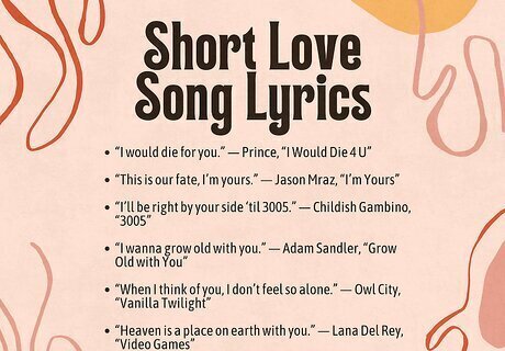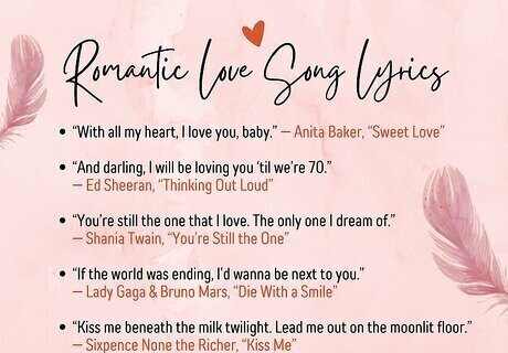 Keep things short and sweet to share your affection. If you’re sending a quick text, writing a social media caption, or talking to someone who isn’t a big romantic, go for a shorter lyric that showcases your feelings. Here are some short love song lyrics that work for various situations: “I would die for you.” — Prince, “I Would Die 4 U” “I can’t lose when I’m with you.” — SZA, “Snooze” “This is our fate, I’m yours.” — Jason Mraz, “I’m Yours” “To you, I'll give the world.” — Fleetwood Mac, “Songbird” “I’ll be right by your side ‘til 3005.” — Childish Gambino, “3005” “I’d trade hours for minutes with you.” — Wisp, “See You Soon” “I wanna grow old with you.” — Adam Sandler, “Grow Old with You” “Sometimes, all I think about is you.” — Glass Animals, “Heat Waves” “When I think of you, I don’t feel so alone.” — Owl City, “Vanilla Twilight” “Heaven is not fit to house a love like you and I.” — Hozier, “Francesca” “Heaven is a place on earth with you.” — Lana Del Rey, “Video Games” “And here we are in heaven. For you are mine.” — Etta James, “At Last” “Only you can set my heart on fire.” — Ellie Goulding, “Love Me Like You Do” “The moon, the stars are nothing without you.” — Sam Smith, “Lay Me Down” “Everything means nothing if I ain’t got you.” — Alicia Keys, “If I Ain’t Got You” “Breathe out, so I can breathe you in, hold you in.” — Foo Fighters, “Everlong” “I’d walk through fire for you. Just let me adore you.” — Harry Styles, “Adore You” “Come with me, my love. To the sea, the sea of love.” — Cat Power, “Sea of Love” “For a chance to be with you, I'd gladly risk it all.” — Chaka Khan, “Through the Fire” “’Cause I’m a fool for you, and the things, the things you do.” — Zayn, “fOoL fOr YoU” “I’m obsessed with you in a way I can’t believe.” — Central Cee, “Obsessed With You”