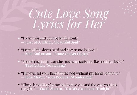 Use a love song lyric to put your heart’s emotions into words. Struggling to convey your feelings for the special woman in your life? Turn to a love song to let her know she makes your heart soar and gives you butterflies! Here are the cutest love song lyrics for her: “I want you and your beautiful soul.” — Jesse McCartney, “Beautiful Soul” “And I thank God every day for the girl He sent my way.” — Benson Boone, “Beautiful Things” “Just pull me down hard and drown me in love.” — Matt Nathanson, “Come On Get Higher” “Suddenly, you’re mine. And it’s brighter than sunshine.” — Aqualung, “Brighter Than Sunshine” “Something in the way she moves attracts me like no other lover.” — The Beatles, “Something” “You never need to doubt it. I’ll make you so sure about it.” — The Beach Boys, “God Only Knows” “I’ll never let your head hit the bed without my hand behind it.” — John Mayer, “Your Body Is a Wonderland” “‘Cause you make me feel so brand new, and I want to spend my life with you.” — Al Green, “Let’s Stay Together” “There is nothing for me but to love you and the way you look tonight.” — Frank Sinatra, “The Way You Look Tonight” “Well, I found a girl, beautiful and sweet. Oh, I never knew you were the someone waiting for me.” — Ed Sheeran, “Perfect” “Anything’s possible since you made my heart melt. Gave me the best hand that I’d ever been dealt.” — Justin Bieber, “All Around Me” “You fill my heart with gladness. Take away all my sadness. Ease my trouble, that’s what you do.” — Rod Stewart, “Have I Told You Lately” “I'll follow you into the park through the jungle, through the dark. Girl, I never loved one like you.” — Edward Sharpe and the Magnetic Zeros, “Home” “Oh, angels sent from up above. You know you make my world light up. When I was down, when I was hurt, you came to lift me up.” — Coldplay, “Hymn for the Weekend” “It was written that I would love you from the moment I opened my eyes. And the morning when I first saw you gave me life under calico skies.” — Paul McCartney, “Calico Skies”