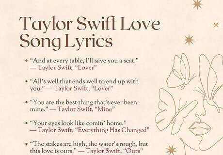 Turn to a Taylor Swift lyric if they’re the ultimate Swiftie. From “Lover” to “Invisible String,” there are so many beautiful love songs in Taylor’s repertoire. Here are some of the most iconic and romantic lyrics from every era: “And at every table, I’ll save you a seat.” — Taylor Swift, “Lover” “All’s well that ends well to end up with you.” — Taylor Swift, “Lover” “You are the best thing that’s ever been mine.” — Taylor Swift, “Mine” “Your eyes look like comin’ home.” — Taylor Swift, “Everything Has Changed” “The stakes are high, the water’s rough, but this love is ours.” — Taylor Swift, “Ours” “And my waves meet your shore, ever and evermore.” — Taylor Swift, “long story short” “You showed me colors you know I can't see with anyone else.” — Taylor Swift, “illicit affairs” “I once believed love would be black and white, but it's golden.” — Taylor Swift, “Daylight” “I woke up just in time, now I wake up by your side, my one and only, my lifeline.” — Taylor Swift, “Dress” “And you know that I'd swing with you for the fences. Sit with you in the trenches.” — Taylor Swift, “Peace” “I want you for worse or for better, I would wait forever and ever.” — Taylor Swift, “That’s How You Get the Girl” “Every time you smile, I smile. And every time you shine, I'll shine for you.” — Taylor Swift, “Jump Then Fall” “And isn't it just so pretty to think all along there was some invisible string tying you to me?” — Taylor Swift, “Invisible String” “In the middle of the night, when I’m in this dream, it’s like a million little stars spelling out your name.” — Taylor Swift, “Untouchable” “‘Cause the sign on your heart said it’s still reserved for me. Honestly, who are we to fight the alchemy?” — Taylor Swift, “The Alchemy”
