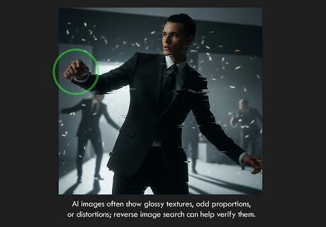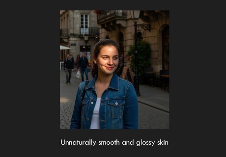 For images: glossy textures and unnatural proportions. AI images tend to have glossy-textured people and backgrounds that don’t resemble real photos. This glossy effect is present in most AI photos, but if you don’t notice it, look for unnatural bodily proportions, like fingers that are too big, too many teeth or fingers, hair without follicles, or feet that are too small for the body. Distortions in the image are also a sign of AI-generation, like mismatched earrings, distorted backgrounds, and illegible text. If you’re unsure whether or not an image is AI-generated, reverse image search it to see if you can track down its origin. If it’s popular on social media but not any reputable sources, it’s likely AI-generated. Check the metadata for AI alterations, too. You can learn how to spot AI Art, too. Want to test how well you can detect AI images? Check out this “spot the AI image” game.