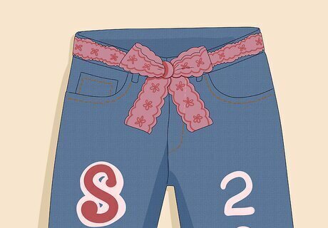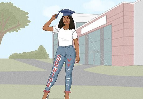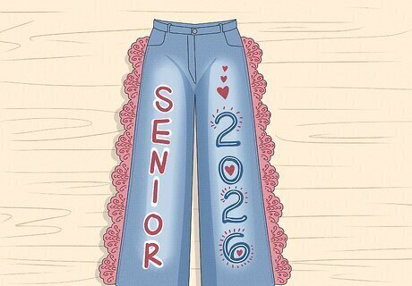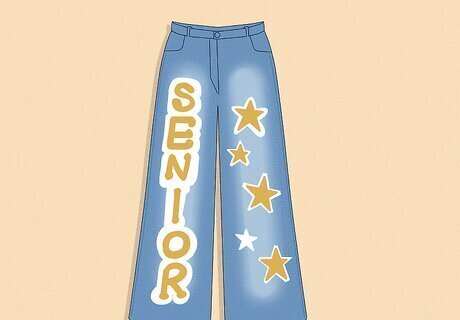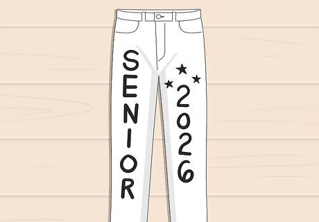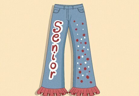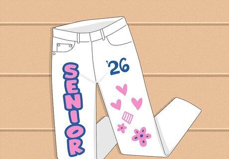 White Jeans Most seniors will probably choose blue jeans, so why not stand out with a pair of white jeans? White jeans provide a clean, blank canvas to work on, and any designs you add will seem brighter and bolder. For example, use some iron-on transfer letters in your preferred colors and patterns for a cute and clean look. Then, loop a ribbon through your belt loops for an adorable belt!
