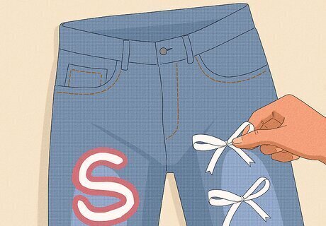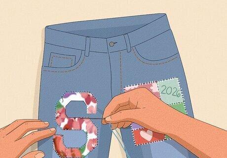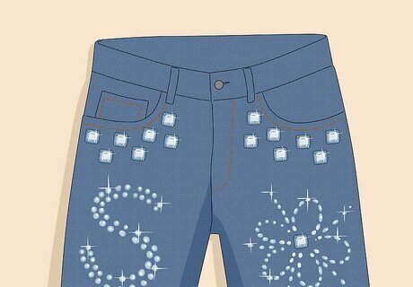 Add any embellishments or decorations. When your jeans are completely dry, personalize them even more by adding fringe, ribbons, patches, gemstones, or any other decorations you like. Either sew your decorations on or use fabric glue to hold them in place. Get creative with it!