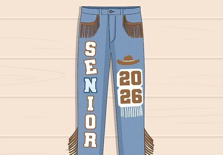 Fringe Jeans Maybe your school mascot is a cowboy, or maybe you’re into a vintage, bohemian aesthetic. Either way, fringe is the way to go! Attach some fringe trim to your pockets and paint some bold lettering on the legs. Add cute patterns and symbols that match your desired effect—like cowboy hats for a Western theme, or stars and flowers for a groovy vibe.