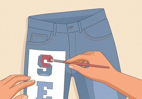 Paint your jeans with fabric paint. Once you’ve finalized your design, grab some fabric paint and get to work. It may be a good idea to fill your jeans with scrap fabric so the paint doesn’t bleed through to the other side. Let one side of your pants dry completely before painting the other side. If you want to show school spirit, buy fabric paint in your school’s colors. Otherwise, use whatever colors you like! If you don’t want to paint your jeans, add iron-on letters and numbers instead. If you have access to one, use a Cricut to cut out your own designs!