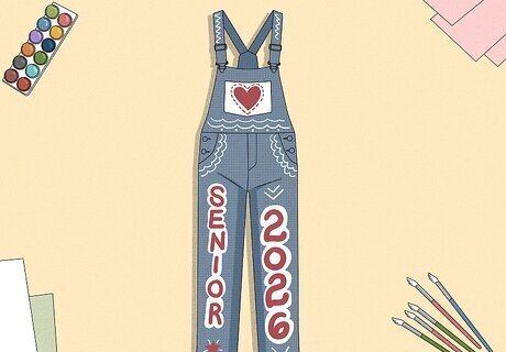 Senior Overalls Your senior jeans don’t technically have to be jeans. If you want something more unique, decorate a pair of overalls! This also gives you a lot more space to work with, so you can add even more fun designs! Paint your main design on the fabric that covers your torso—this can be your name, your mascot, or anything important to you.