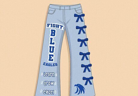 Quilted Jeans Feeling extra crafty? If paint isn’t really your thing, sew some quilting scraps into a unique design. Grab a bunch of fabric scraps of different patterns in your school’s colors. Cut out some letters to decorate one leg, then sew the remaining scraps onto the other leg for a pop of color. If you don’t know how to sew, attach the fabric with fabric glue.