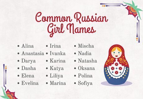 Pick one of these popular Russian names if you want a sure thing. These names are a bit more common, which means they’re classic and well-loved. They’ve withstood the test of time, so you can rest assured that they won’t go out of style! Here are some of our favorite options: Aleksandra: “Defender of the people.” Alina: “Bright” or “beautiful.” Alisa: “Great happiness” or “joy.” Anastasia: “Resurrection.” Anya: “Grace.” Darya: “Possessing goodness.” Dasha: “Possessing goodness.” Elena: “Moon.” Evelina: “Life.” Irina: “Peace” or “peaceful.” Ivana: “God is gracious.” Ivanka: “God is gracious.” Karina: “Pure” or “chaste.” Katerina: “Pure.” Katya: “Pure” or “perfect.” Liliya: “Lily.” Marina: “Of the sea.” Mariya: “Beloved” or “drop of the sea.” Mischa: “Who is like God?” Nadia: “Hope.” Natalya: “Birthday of Christ.” Natasha: “Born on Christmas Day.” Oksana: “Praise to God.” Polina: “Small” or “humble.” Sofiya: “Wisdom.” Sonya: “Wisdom.” Svetlana: “Shining star.” Tanya: “Honorable.” Tasha: “Christmas Day.” Tatiana: “Fairy queen.” Tiana: “Princess.” Vanya: “God is gracious.” Viktoriya: “Victory.” Yelena: “Shining light.” Yulia: “Youthful” or “young.” Zoya: “Life.”