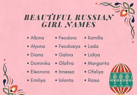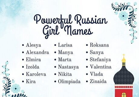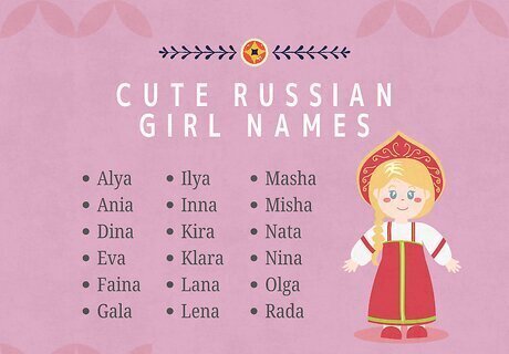 Choose one of these short, bouncy names if you want a cute option. Your little girl’s name doesn’t have to be super long or imposing! A short name with an adorable energy could be totally perfect for her. Here are some of our favorite cute Russian names for girls: Alya: “Lion.” Anja: “Graciousness.” Ania: “Gracious.” Anna: “Grace” or “favor.” Dina: “Judgment.” Eva: “Life.” Faina: “Shining” or “crown.” Gala: “Calm.” Ilya: “The lord is my God.” Inga: “Guarded by Ing.” Inna: “Rough stream.” Ira: “Peace.” Kira: “Young.” Klara: “Clear” or “bright.” Lana: “Shining” or “light.” Lara: “Citadel.” Lena: “Bright” or “beautiful.” Liza: “God is my oath.” Luda: “Love of the people.” Masha: “Star of the sea,” “beloved,” or “wished for child.” Mila: “Loved by the people,” “gracious,” or “dear one.” Misha: “Who resembles God?” Nata: “Christmas Day.” Nika: “True image.” Nina: “Little girl.” Olga: “Holy.” Rada: “Happy” or “willing.” Raya: “Friend.” Rita: “Pearl.” Vera: “Faith.” Yana: “Youthful.” Yeva: “Life.” Yula: “Little bear.” Zina: “Hospitable” or “to shine.”