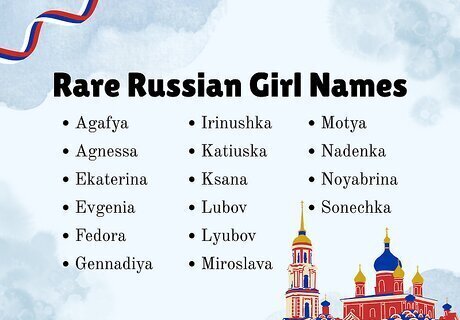 Opt for one of these rare Russian names for a more unique choice. If you want your little one to have some serious star quality, consider one of these slightly less common names. Going with a rarer option makes it less likely that your daughter will share a name with another child in her class, which means she’s sure to stand out in the crowd! Agafya: “Good.” Agnia: “Chaste.” Agnessa: “Chaste.” Agrafena: “Feet first.” Alevtina: Variation of “Valentina.” Anoushka: “Grace” or “favor.” Anzhela: “Angel.” Anzhelina: “Angelic.” Ekaterina: “Pure.” Evgenia: “Well-born,” “noble,” or “aristocrat.” Fedora: “Gift of God.” Gennadiya: “Noble” or “generous.” Irinushka: “Peace.” Katiuska: “Pure,” “clean,” or “clear.” Klavdiya: Russian form of “Claudia.” Ksana: “Praise be to God.” Lubov: “Love” or “beloved.” Ludmila: “Beloved of the people.” Lyubov: “Love.” Lyudmila: “People’s favor.” Miroslava: “Peaceful glory.” Motya: “Nimble” or “quick.” Nadenka: “Hope.” Nadezhda: “Hope.” Noyabrina: “November.” Sonechka: “Wise.” Taisiya: “Clever” or “witty.” Ulyana: “Youthful.” Yanina: “God is gracious.” Yekaterina: “Pure” or “innocent.” Yelizaveta: “Consecrated to God.” Yeseniya: “Palm tree” or “flower.” Varvara: “Foreign woman.” Zhenya: “Well-born.” Zlata: “Golden.” Zoyechka: “Life.”