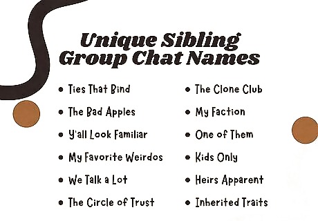 Pick a fun group chat name for you and your siblings. You may already have a family group chat with your parents, but your parents don’t need to know everything. Having a gc with just your siblings is a great way to bond with them. Here are some fun group chat names to choose from: Keeping Up with the [Last Name] House of [Last Name] Modern Family All in the Family Full House Family Ties Team [Last Name] The Family Tree We Are Family The [Last Name] Bunch The Proud Family Family Matters Sister, Sister Brothers & Sisters The Bros Brotherly Love Soul Sisters Family First The Family Knots Family Time Sibling Shenanigans Band of Brothers The Family Treehouse Next of Kin Emergency Contacts