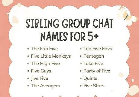Come up with a fun name for a larger group. If there are five or more of you, name your group chat after a larger group, like the Avengers or the Power Rangers. Alternatively, make a play on words based on the total number of siblings you have. Here are some examples: The Fab Five The Quintessential Sibs The [Last Name] Five Five Little Monkeys The Elite 5 The High Five Five Guys A Handful of Siblings Jive Five Fifth Harmony The Avengers The Power Rangers Top Five Favs Pentagon Saturday Night Five Take Five The Breakfast Club Five Points for Gryffindor Party of Five Quints Five Stars Feisty Five Fearless Five I Will Sur-Five The [Last Name] Quintet