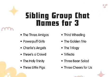Name your group chat after an iconic trio. Dynamic duos shouldn’t get all the fun; there are also plenty of popular trios across pop culture. If you have two siblings, naming yourselves after a trio ensures no one feels left out. Here are some great trio names to choose from: The Three Amigos The Three Musketeers Powerpuff Girls Charlie’s Angels Alvin and the Chipmunks Three’s a Crowd BLT The Holy Trinity Neapolitan Ice Cream Three Little Pigs Dynamic Duo (Plus One) Third Wheeling Three French Hens The Golden Trio The Three Wise Men The Trilogy Triple Threat Trifecta Three Brain Cells Three’s a Crowd Three Bean Salad Three Cheers for Us Three Times the Fun The Terrific Trio Three Ring Circus