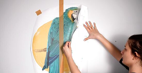 Apply the right side of the decal, then repeat on the left side. Starting from the center, roll the sticker back into place, pressing it firmly into place with your hands. Then, use a squeegee to smooth out any air bubbles. Remove the tape hinge, then fold over the left side of the sticker and pull away any remaining backing. Carefully apply the left side of the sticker to the surface, pressing down firmly as you go, then finish smoothing out any air bubbles.