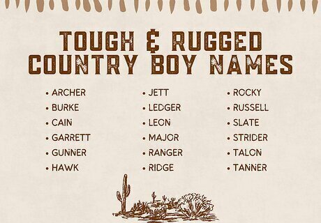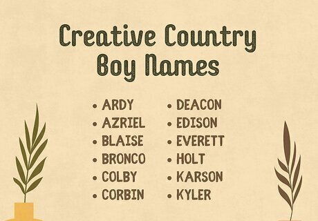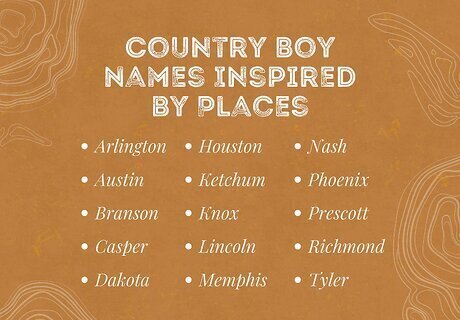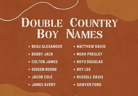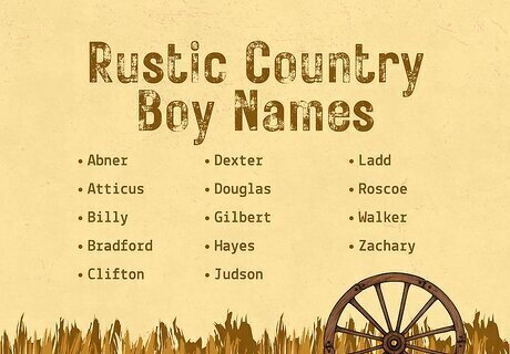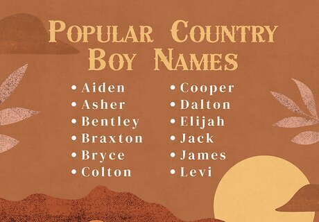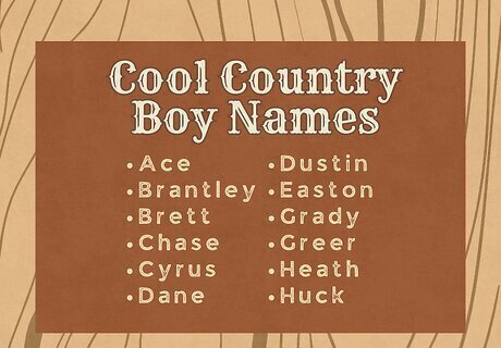 Pick a traditional country name. “Traditional [and] classic names are cornerstone names for a reason,” says Prior. Many of them have been popular for generations and simultaneously feel vintage and modern. If you want a name that screams “country,” try one of these: Beau (French for “beautiful”) Bennett (Latin for “blessed, well-spoken”) Bobby (English and German for “bright, fame”) Buddy (English for “friend, companion”) Caleb (Hebrew for “dog, whole”) Carter (English for “one who uses a cart”) Christian (Latin, Greek, and English for “follower of Christ”) Clarence (Latin for “clear, bright”) Cody (Irish and English for “helpful”) Daniel (Hebrew for “God is my judge”) Dean (English for “valley”) Earl (English and German for “nobleman, warrior”) Emmett (German for “universal”) George (Greek for “farmer”) Hunter (English for “one who hunts”) Jasper (Latin for “treasurer”) Jonah (Hebrew for “dove”) Junior (Latin for “the younger one”) Maddox (Welsh for “good, fortunate”) Sawyer (English for “woodcutter”) Shiloh (Hebrew for “tranquil”) Tucker (English for “cloth-softener”) Wesley (English for “west meadow”)