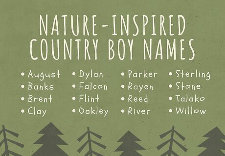 Name your child after the natural world around you. Most country folks appreciate the great outdoors. Whether you enjoy hunting, fishing, hiking, or anything else, consider naming your child after the natural world. It may even encourage them to get active and enjoy being outside when they’re older! Here are some examples: August (Latin for “exalted;” the fall season) Banks (English for “someone who lives near a bank) Bear (German and English for “the brown one”) Brent (English for “hill, high place”) Brooks (English for “someone who lives near a brook”) Clay (English for “clay settlement”) Dylan (Welsh for “son of the sea, born from the ocean”) Falcon (Latin for “bird of prey”) Finch (English for “small bird”) Flint (English for “flint stone, stream”) Forrest (English and Scottish for “woodland”) Oakley (English for “oak clearing”) Parker (English for “keeper of a park”) Rayen (English for “raven”) Reed (English for “red,” a tall plant that grows in water and marshy areas) River (English for “flowing body of water”) Sterling (English and Scottish for “excellent, little star;” an alloy of silver) Stone (English for “rock”) Talako (Choctaw for “eagle”) Willow (English for “willow tree”) Woods (English for “woodland”) Wren (English for “small, brown songbird”)