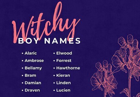Turn every day into Halloween with a witchy name. Whether you’re naming a character or looking for a spooky name for your son, try something with a witchy vibe. Witchy names often sound old-fashioned or inspired by nature. Try one of the following options: Alaric (German for “ruler of all”) Ambrose (Greek for “immortal”) Bellamy (French and Irish for “handsome friend”) Bram (Dutch for “father of many”) Damian (Greek for “to tame”) Draven (Celtic for “to break apart”) Elwood (English for “from the old wood”) Forrest (English and Latin for “woodland”) Hawthorne (English for “thorn bush”) Kieran (Irish for “little dark one”) Linden (English and German for “linden tree”) Lucien (French for “light”) Magnus (Latin for “greatest”) Marius (Latin for “warlike, of Mars”) Morgan (Welsh for “sea-born”) Onyx (Greek for “claw, a black gemstone”) Orion (Greek for “heaven’s light”) Percival (French for “pierce the valley”) Phoenix (Greek for “dark red”) Ronan (Irish for “little seal”) Rowan (Irish and Scottish for “little red one”) Salem (Hebrew and Arabic for “peaceful, safe, complete, perfect”) Soren (Scandinavian for “stern, severe”) Tobias (Hebrew for “God is good”) Zephyr (Greek for “west wind”) Want even more ideas? Take a look at our Witchy Names article!