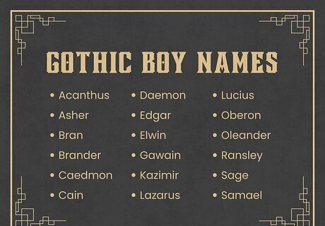 Choose a mysterious, brooding name for a gothic vibe. If you’re looking for a gothic baby name, Hodgson recommends names that feel dark, mysterious, and historic, like Benedict, Octavian, and Sebastian. Here are some other boys’ names that have a gothic vibe: Acanthus (Greek for “thorn”) Asher (English for “ash tree, smoldering fire”) Bran (Welsh for “raven”) Brander (English for “sword, touched by flame”) Caedmon (Anglo-Saxon for “poet”) Cadell (Welsh for “battle”) Cain (Hebrew for “spear”) Corbin (French and English for “little crow, raven”) Daemon (Greek and English for “guardian spirit; servant of the devil”) Edgar (English for “fortunate spear”) Elwin (English for “elf”) Gawain (Welsh for “white falcon”) Kazimir (Slavic for “destroyer of peace”) Lazarus (Hebrew for “God has helped”) Lucius (Latin for “light”) Oberon (German for “bear-like”) Oleander (Greek for “evergreen tree”) Ransley (English for “raven meadow”) Sage (English for “wise”) Samael (Hebrew for “God has heard”) Silas (Latin and English for “forest”) Tierney (Gaelic for “lord”) Tristan (Welsh for “sad”) Victor (Latin and English for “winner”) Vladimir (Slavic for “great power”) Looking for girl names, too? Check out our Goth Girl Names article!