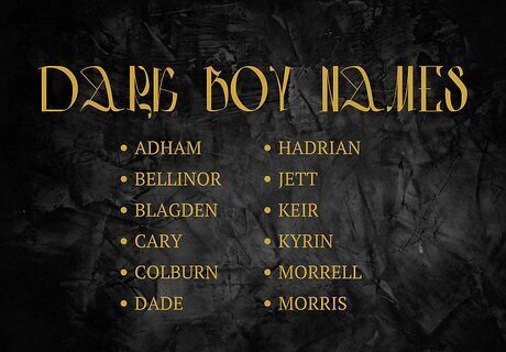 Choose a name that means “dark.” If you’re looking for a literal dark name, there are plenty of options that mean “dark,” “dark-haired,” or something similar. For example, Prior likes names like Donahue (meaning “dark warrior) and Ciaran, which means “dark-haired.” Here are some other popular and unique dark boy names: Adham (Arabic for “black”) Bellinor (French for “beautiful and dark person”) Blackwell (English for “dark well”) Blagden (English for “dark alley”) Blake (English for “dark”) Cary (Irish for “dark ones”) Chaya (Sanskrit for “shadow”) Colburn (English for “dark brook”) Cole (English for “swarthy, black coal”) Dade (Gaelic for “dark one”) Darcy (Irish for “dark”) Dargan (Irish for “dark-haired”) Donovan (Irish for “dark”) Douglas (Scottish for “dark river”) Hadrian (Scandinavian for “dark one”) Jett (English for “black”) Keir (Gaelic for “dark-haired”) Kyrin (Irish for “dark-haired”) Morrell (Latin for “dark-skinned”) Morris (Latin for “dark”) Noir (French for “black”) Orpheus (Greek for “darkness of the night”) Ozul (Hebrew for “shadow”) Sullivan (Irish for “little dark eyes”) Sunil (Sanskrit for “very dark blue”) Meet the wikiHow Experts Sonya Prior is a baby naming expert and content creator known as the BB Namer based in Auckland, New Zealand. She shares name content to over 30K followers across Instagram and TikTok. Chloe Hodgson is a baby name expert based in the UK. She’s been fascinated by names for as long as she can remember and began sharing her passion on Instagram in 2018.