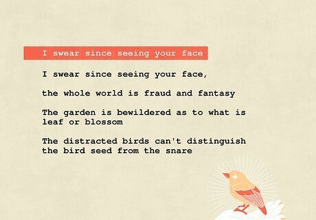 I swear since seeing your face I swear since seeing your face,the whole world is fraud and fantasyThe garden is bewildered as to what is leaf or blossomThe distracted birds can't distinguish the bird seed from the snare