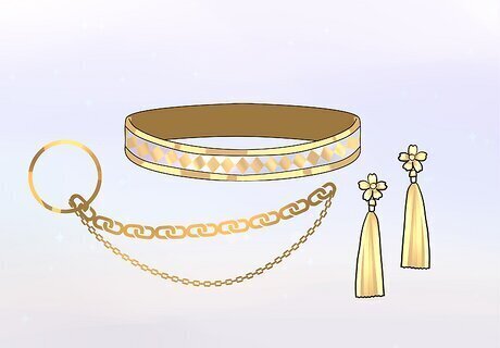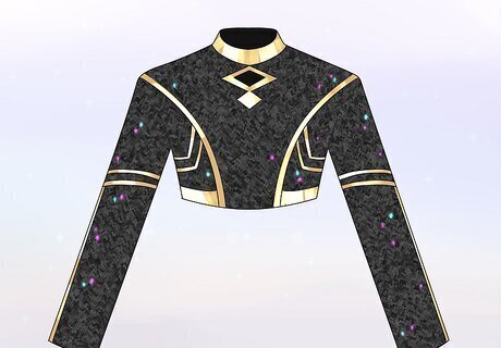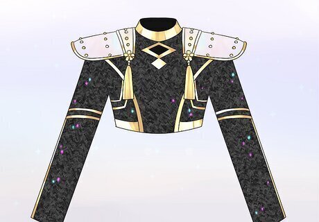 TopZoey’s “Golden” top is a black, cropped, long-sleeve shirt with golden detailing and epaulettes on the shoulders; meanwhile, her “What It Sounds Like” top is nearly the same, but the black shirt is white instead. Choose your version of Zoey (black shirt or white shirt), and then use gold fabric tape to add the detailing to your shirt. The gold trim at the bottom of her shirt is extra-wide, and the rest is finer. Zoey’s top has a diamond-shaped cutout just below the neckline. You can look for a shirt with a cutout or just make the cutout yourself! Trace a diamond shape on the shirt and use scissors to cut the shape out. Then, line the new cutout with gold fabric tape! If you’re just looking for a premade Zoey costume, we’ve got you covered! You can get them online, on sites like Amazon and EZCosplay.