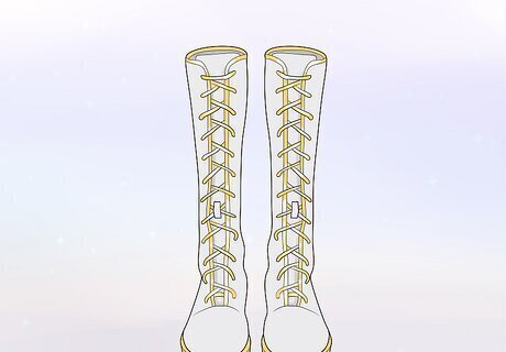 ShoesZoey wears white lace-up boots (with gold-colored laces) during the “Golden” and “What It Sounds Like” numbers. The boots cover her shins, stopping before her knees. Find a pair of boots that work for you; then, if you’re a stickler for detail, remove the regular laces and add gold shoelaces instead.