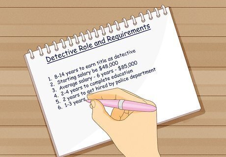 Know what to expect from a detective role before you get started. For instance, consider the time investment. It takes between roughly 8-14 years to earn your title as a detective. Also, realize that some specializations take even more time, like homicide or forensics. Then, reflect on the compensation—plan on a starting salary of $48,000. $85,000 is the average salary for a detective that has been working for around 6 years. Typically, it takes 2-4 years to complete your education, 2 years to be hired by a police department, 2-5 years to earn experience as an officer, and 1-3 years to train as a detective. Other common specializations include due diligence detectives, insurance claim detectives, missing property detectives, and SVU detectives.