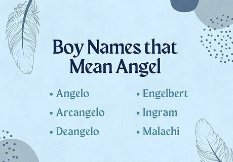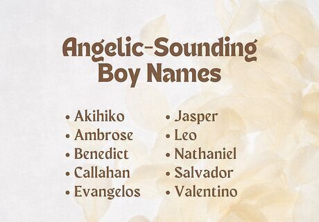 Instead of giving your baby boy a name that directly means “angel,” consider giving him a name that embodies angelic qualities, like purity and strength, or one that simply sounds angelic. Here are some great options: Akihiko: “Bright boy,” Japanese origin. Ambrose: “Immortal,” Greek origin. Benedict: “Blessed,” Latin origin. Callahan: “Bright-headed,” Irish origin. Evangelos: “Bringer of good news,” Greek origin. Jasper: “Treasure,” Persian origin. Leo: “Lion,” Greek origin. Nathaniel: “Gift of God,” Hebrew origin. Salvador: “Savior,” Spanish origin. Valentino: “Strength” or “health,” Italian origin.