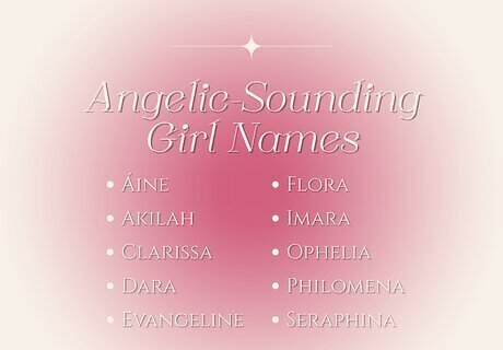 Giving your baby girl a name that symbolizes angelic qualities, like “wisdom” and strength,” is a great alternative to choosing a name that means “angel.” Or, choose a name that just sounds angelic. Check out these great ideas: Áine: “Radiance” or “brightness,” Irish origin. Akilah: “Intelligent” or “wise,” Arabic origin. Clarissa: “Bright” or “clear,” Latin origin. Dara: “Pearl of wisdom,” Hebrew origin. Evangeline: “Bearer of good news,” Greek origin. Flora: “Flower,” Latin origin. Imara: “Strong” or “steadfast,” Swahili origin. Ophelia: “Help” or “advantage,” Greek origin. Philomena: “Beloved” or “lover of strength,” Greek origin. Seraphina: “Fiery ones,” Latin origin.