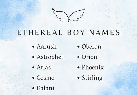 Angels are associated with the heavens, so consider choosing an ethereal and celestial-inspired name for your baby boy. For example: Aarush: “First ray of sun,” Sanskrit origin. Astrophel: “Star lover,” Greek origin. Atlas: “Enduring,” Greek origin. Cosmo: “Order” or “harmony,” Greek origin. Kalani: “Of the heavens,” Hawaiian origin. Oberon: “Royal bear,” German origin. Orion: “Heaven’s light,” Greek origin. Phoenix: “Dark red,” Greek origin. Stirling: “Little star,” British origin.