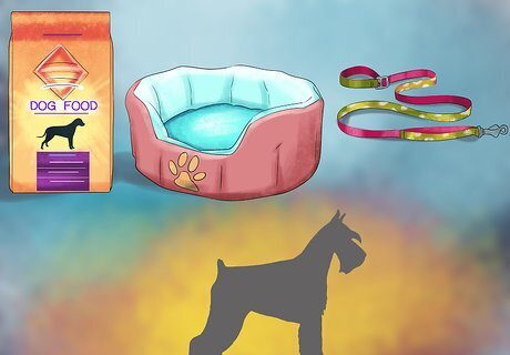 Purchase all the supplies you’ll need. A new dog requires a lot of supplies. You’ll need to purchase them ahead of time so that your house is ready when you bring your new schnauzer friend home. Make sure you plan ahead so that you don’t find yourself missing something when your pup arrives. You will need to purchase food, food/water dishes, collar, ID tag, leash, dog bed, and several toys and treats, and possibly a crate.