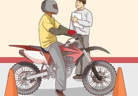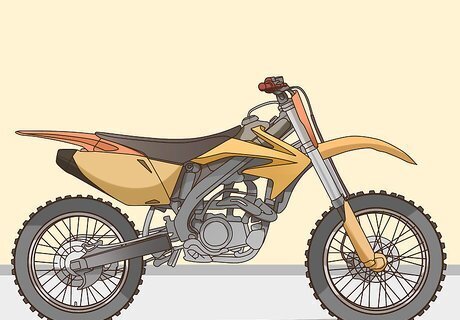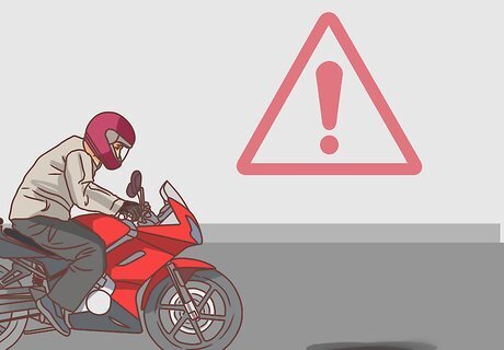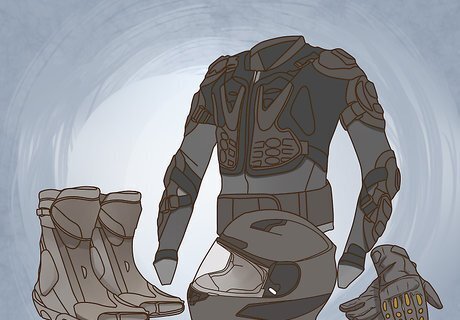 Buy motorcycle safety gear. Do an online search to find a specialized motorcycle gear store in your area. When you visit the store, an associate will help you choose gear that fits and that meets safety standards. If you buy your gear used or online, you don’t have a guarantee that it will protect you. Always wear your gear, especially your helmet. Safety gear includes: A motorcycle helmet Riding boots Gloves Leathers (protective leather clothing) Body armor