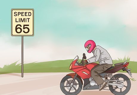 Follow any speed limits. It can be tempting to race down the road at top speed. However, if you go too fast, you won’t be as aware of the road. For example, if you’re speeding, you may not have time to swerve and avoid a patch of gravel. Other dangers include: Not being able to turn properly because you’re going too fast Running into a car, person, or animal Hitting a patch of water and hydroplaning