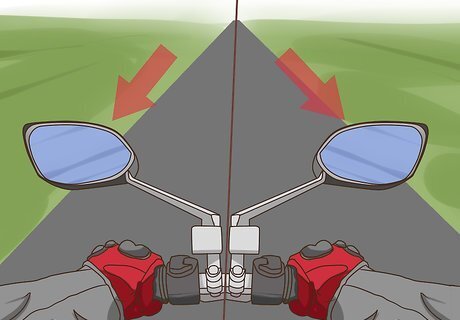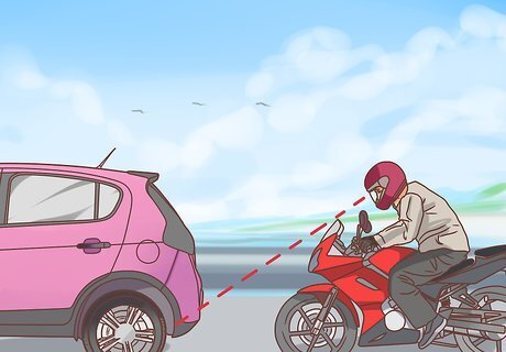 Behave as if no car can see you. Many drivers have trouble spotting motorcycles on the road, whether because of a blind spot or because they’re not paying attention. Whenever you’re driving near a car, assume that the rider cannot see you. For example: Stay away from potential blind spots by riding in front of or behind a car. When a car is backing up, assume they won’t see you in time to stop. Let them finish and then continue on your way. If a car is merging into your lane, give them space. If they can’t see you they will run you over.