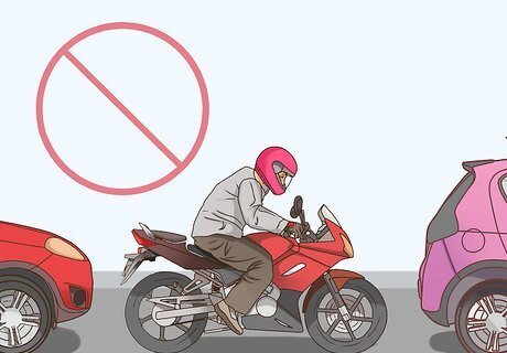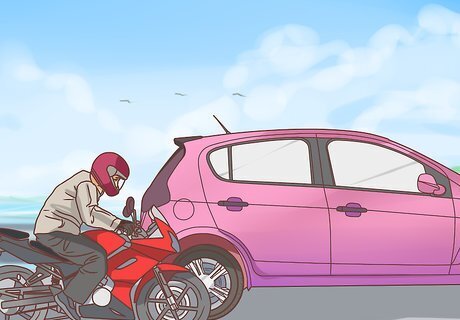 Avoid getting rear ended at stop lights. Many cars overlook a motorcycle that’s parked at a light. To avoid getting hit, create a buffer between you and oncoming traffic by pulling in front of the car in front of you. Make sure to give the car a friendly wave as you move around them. Other methods of stopping at intersections include: Stopping between traffic lines so that cars can’t hit you Stopping to the side of the lane, giving you an escape route