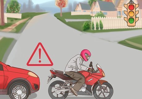 Be careful of cars turning left at intersections. Many motorcyclists are hit at intersections by cars turning left on top of them. In fact, this is the most common type of motorcycle and car collision. To avoid getting hit, keep an eye on approaching car’s blinkers and give them plenty of room to turn. If a car turns left near you without using their blinker, you may need to speed up or swerve to avoid them.