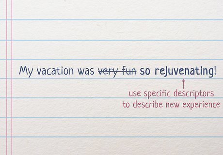 Choose adjectives like “exhilarating” to describe a new experience. Avoid using terms like “very fun” or “very interesting” when talking about a recent trip, adventure, or new experience that you’ve been on. Instead, try to describe exactly how “fun” or “interesting” your experience was. Use terms like “exhilarating,” “thrilling,” “rejuvenating,” or “mentally stimulating” to describe a positive experience, and words like “unbearable,” “mind-numbing,” “insufferable,” or “unendurable” to describe a negative one. For instance, if you went on an island vacation, you could say something like: “My vacation was so rejuvenating! I had a fantastic time snorkeling and relaxing on the beach.” If you had a less enjoyable experience, you could say something like: “I hate the new pizza restaurant that opened up in town. The food was disgusting, and the wait staff were rude and unbearable.” As you look for a better adjective, imagine yourself going one level of detail deeper and thinking of related words the way an online search engine would.