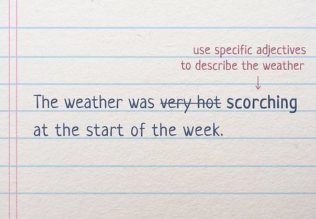Describe the weather with specific adjectives. You don’t have to give your friends, family members, and acquaintances an exact temperature to describe the weather, but using terms like “very hot” and “very cold” aren’t very informative. If it’s incredibly chilly outside, opt for words like “frigid” or “freezing” to describe the weather. If it’s hot and sunny, use “scorching” or “blazing” to describe your surroundings. For example, 90 to 100 °F (32 to 38 °C) weather could be described as scorching, while 60 to 70 °F (16 to 21 °C) may be referred to as pleasant.