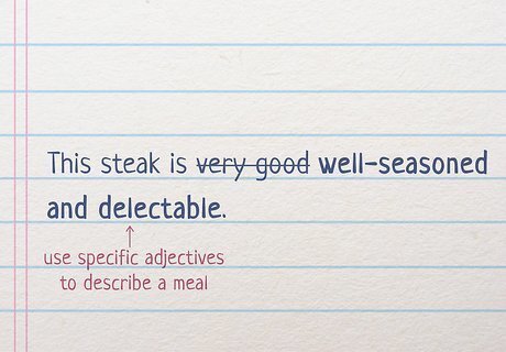 Describe a meal as “tasty” or “delicious” instead of “very good.” Whether you’re eating at a restaurant or enjoying a home-cooked dish, try to think of specific, positive adjectives that describe the food you’ve just eaten. For more general compliments, you could try “yummy,” “scrumptious,” or “mouth-watering.” If you’d like to be more specific, try using descriptors like “well-seasoned,” “savory,” or “aromatic.” Don’t say, “This steak is very good!” Instead, try saying something like, “This steak is well-seasoned and delectable.”