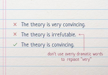 Don’t replace “very” with overly dramatic words. When removing or switching out “very” in a sentence, try not to use words that exaggerate or misinform the reader. Instead, choose a word that matches the emphasis that “very” would have added to the sentence. For instance, if the original sentence was “The theory is very convincing,” don’t use “irrefutable” as a replacement word for “very convincing.” Instead, say that “The theory is convincing.”