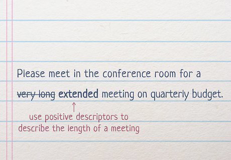 Use terms like “brief” or “extended” to describe the length of a meeting. Don’t use a term like “very long” to describe the length of a gathering, as this may be off-putting to your co-workers and superiors. Instead, opt for language that gives a general sense of the meeting’s length without setting any negative expectations. Similarly, use language like “short,” “brief,” or “quick” when describing a meeting that you’d don’t expect to take long. For instance, say something like: “Hey everyone! Please meet in the conference room for an extended meeting on our quarterly budget. As soon as we go through the agenda, you’ll all be free to go!”