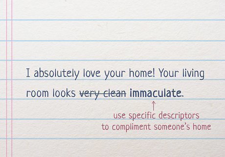 Compliment someone’s home by calling it “spotless.” When you’re a guest at someone’s home, make your small talk meaningful by pointing out how lovely their home looks. Use terms like “spotless,” “gleaming,” or “immaculate” in your compliments, or opt for words like “elegant,” “orderly,” “tidy,” or “bright.” For instance, you could say something like: “I absolutely love your home! Your living room looks immaculate, and your throw pillows match the rug perfectly.”