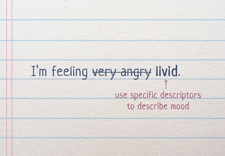 Reveal your current mood with specific descriptors. Choose words that match the exact state of your mood, like “thrilled,” “ecstatic,” “depressed,” “miserable,” or “livid.” If you use a phrase like “very upset” to describe your mood, listeners may not know if you’re sad, angry, or a mixture of both emotions. Instead, choose a word that caters to the severity of your mood, whether it’s positive or negative. For instance, you could say “I’m feeling joyful” if you’re having a great day instead of saying “I’m feeling very happy.” Similarly, saying “I’m feeling livid” carries more weight in a conversation than “I’m feeling very angry.”