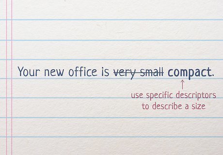 Pick terms like “compact” when referring to size. Avoid using phrases like “very big” or “very small” to describe the size of a building or other object, as this is vague and unhelpful to the listener. Instead, think of words that describe the specifics of the property, like “expansive,” “compact,” “widespread,” “far-reaching,” or “compressed.” For instance, saying “Your new office is compact” sounds a lot better than “Your new office is very small.”