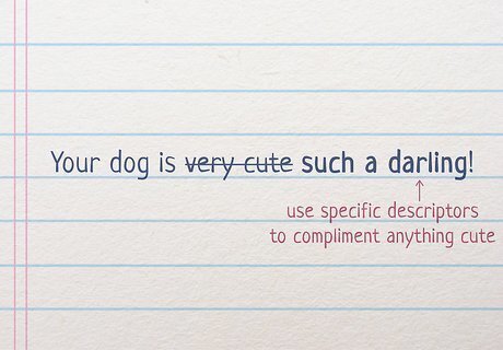 Say that a pet or small child is “adorable” instead of “very cute.” Try to avoid cliches when complimenting a small child, animal, or something else that’s cute. “Adorable” is a great replacement for “very cute,” though you can make your kind statement even more meaningful with especially detailed adjectives. When commenting on a pet, use words like “charming,” “fluffy,” or “beautiful” to describe the animal. If you’re complimenting a baby or small child, terms like “darling,” “delightful,” or “precious” may be used. For example, if you’re meeting your neighbor’s dog for the first time, you could say something like: “Your dog is such a darling! How old are they?”