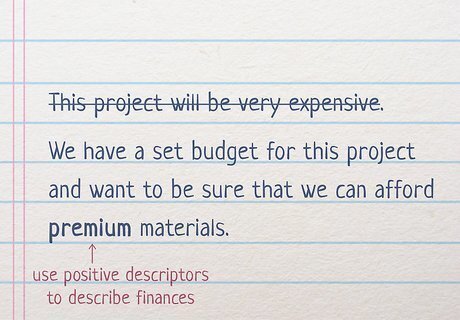 State that a project will be “costly” instead of “very expensive.” If you’re creating a proposal, financial plan, or some other document that involves finances, try to remove any words or phrases that have a negative financial connotation. Instead of saying “very expensive,” use terms like “costly” or “premium” as descriptors. For example, if you’re trying to get people to invest in a new project, don’t say “This project will be very expensive,” as this might discourage possible investors. Instead, say something like, “We have a set budget for this project and want to be sure that we can afford premium materials.”
