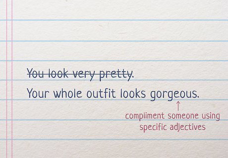 Tell someone that they’re beautiful instead of very pretty. While there’s no exact right way to compliment someone, you can make someone’s day even brighter by using specific words to describe their appearance, as opposed to “very pretty” or “very nice.” Instead of using vague terms or descriptors, use specific adjectives like “gorgeous,” “brilliant,” or “stunning” to comment on a person’s striking features. For example, saying “Your eyes are such a vibrant, beautiful green shade” or “Your whole outfit looks gorgeous” will carry a lot more weight than “You look very pretty.”