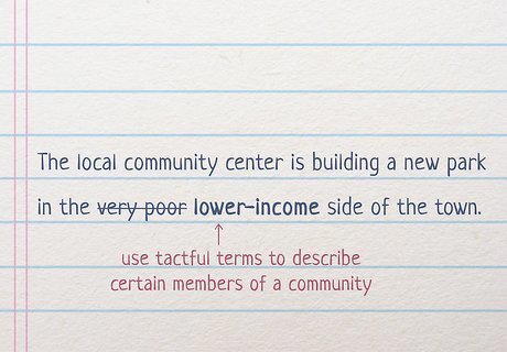 Select tactful terms like “wealthy” instead of “very rich.” In professional correspondence and formal conversations, try to keep your audience in mind. If you use terms like “very rich” or “very poor” to describe certain members of your community, they may feel uncomfortable or a bit put off. Instead, use terms like “wealthy,” “well-established,” “impoverished,” or “low-income.” For instance, try saying something like this: “The local community center is building a new park in the lower-income side of the town.
