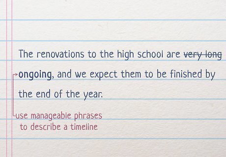 Use words like “ongoing” when discussing a timeline. Don’t use terms like “very long” to describe the estimated deadline for a project or renovation. Instead, try to make the timeline sound manageable. Strive to give an estimated deadline when you share this kind of information as well. For example, you could something like this: “The renovations to the high school are ongoing, and we expect them to be finished by the end of the year.” If you need to step away from a conversation to go to the bathroom, you could say something like: “I’ll be back shortly.”